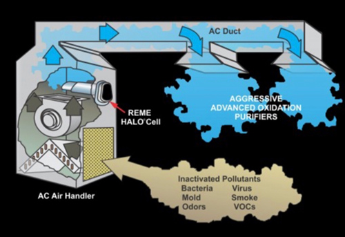 The REME HALO® in-duct air purifier utilizes RGF’s proprietary Reflective Electro Magnetic Energy technology. Installed into the supply plenum of your existing air conditioning or heating system air ducts, the REME HALO® in-duct air purifier produces Hydro-Peroxide plasma that is distributed through the air handler, through the duct system and into the conditioned living space. Unlike passive air technologies, which need pollutants to pass through the unit for purification or filtration, the REME HALO® in-duct air purifier sweeps through your home actively purifying pollutants at the source. In addition, the charged plasma induces particles to coagulate or stick together making them bigger and easier for your filter to catch. Hydroperoxides occur naturally in the earth’s atmosphere and are part of nature’s process of cleaning the air.